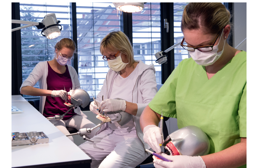 Am Standort Köln stehen neben mehreren Seminarräumen ein Phantomkopfraum und sechs modern, komplett ausgestattete Behandlungseinheiten für den praktischen und klinisch relevanten Unterricht zur Verfügung. Die praktische Ausbildung beginnt direkt im ersten Modul mit dem Skilltraining am Phantomkopf. Die Studierenden werden schrittweise mit den aktuellen evidenzbasierten Methoden der manuellen und maschinellen Instrumentation am Phantomkopf vertraut gemacht. Parallel werden klinische Kenntnisse z. B. zur systematischen Befundaufnahme, zum Patientencoaching und zur Ergonomie am Behandlungsstuhl vermittelt und eingeübt. Nach Bestehen einer praktischen Instrumentationsprüfung am Phantomkopf wird die klinische Ausbildung auf alle nach dem Zahnheilkundegesetz delegierbaren Tätigkeiten in der Prävention und nicht invasiven Behandlung besonders von Parodontalerkrankungen ausgedehnt.