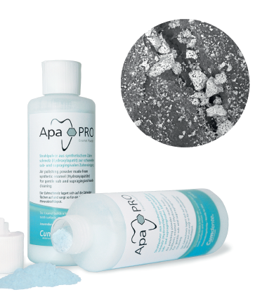 Die Firma Cumdente steht seit 20 Jahren für innovative Dentalprodukte. Mit ApaPro stellt das Unternehmen jetzt ein neues Pulverstrahlmittel für die PZR vor, das zu 100 % aus feinstem medizinischen Hydroxylapatit besteht. Durch die sehr kleine Korngröße von 20 μm können Zahnund Wurzeloberflächen sanft gereinigt und gleichzeitig mit wichtigen Mineralstoffen versorgt werden, betont Cumdente. Durch die poröse Struktur der Zahnschmelzpartikel sollen diese beim Aufprall zerfallen und so eine unerwünschte Beschädigung von Schmelz und Dentin verhindern. ApaPro entfernt sub- und supragingivalen Biofilm, Plaque und Verfärbungen, ohne die Substanz zu beschädigen, und trägt so zur Remineralisierung von angegriffener Zahnhartsubstanz bei. ApaPro unterstützt die Desensibilisierung von empfindlichen Zahnhälsen und freiliegenden Wurzeloberflächen. Das Zahnschmelzpulver wird auch zur schonenden supra- und subgingivalen Reinigung von Implantaten, auch bei periimplantären Entzündungen, eingesetzt.