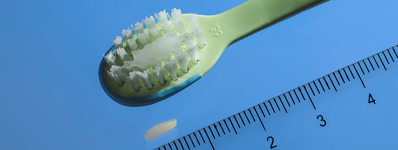 Ab dem ersten Geburtstag gilt dann: Zweimal täglich putzen mit einer reiskorngroßen Menge Zahnpasta mit Fluorid (Abb. 2). Es ist wichtig, dass die Eltern die Zahnpasta genau dosieren. Lawrenz: „Die empfohlene Zahnpastamenge darf nicht überschritten werden, um eine zu hohe Fluoridaufnahme zu vermeiden. Denn Säuglinge und Kleinkinder können Zahnpasta noch nicht ausspucken.“